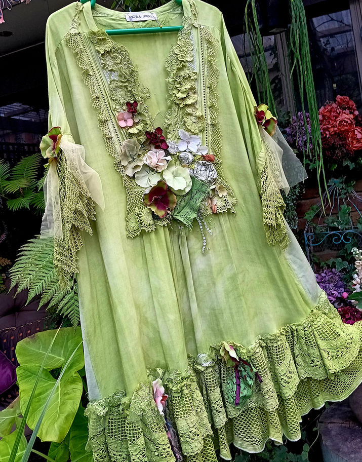 All hand died apple green, and a vintage lace square frames a single red violet on back of tunic.