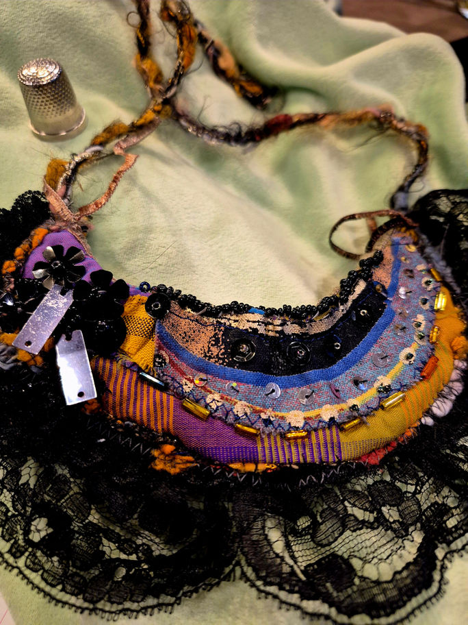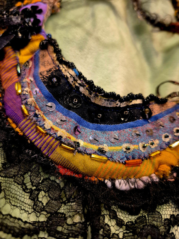 Gold embossed cotton stitched arc panel, vintage bugle beads, modern seed beads, wool framing, fine old black lace border, amber, mauve, purple, black sections of rare fabric type .