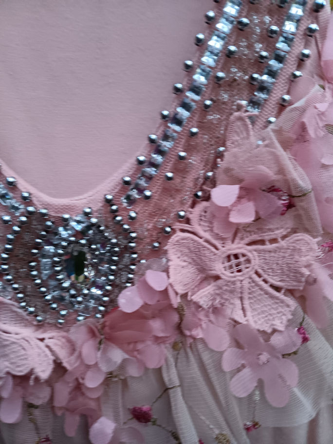 Recycled soft jersey flounced 3-tiered singlet styled top embellished in sourced pink floral motifs and recycled cocktail dress lace. Beaded on tulle netting in silver and square faux crystals in large v-pattern with brilliant oval Swarowski crystal at centre.